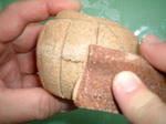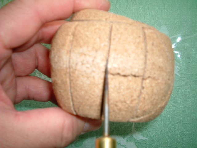 1,人形のボディに頭と手、位置の所に彫刻刀で穴をあけます。